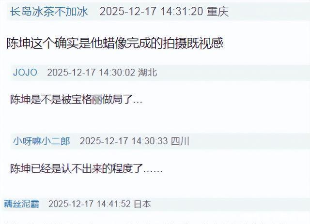 而陈坤整个广告片的设计也似乎和其他三人格格不入,没有那种酷酷的,美美的风范。甚至有点像是刚偷了东西逃跑的落荒感。有网友嘲讽像蜡像,有网友直言认不出。